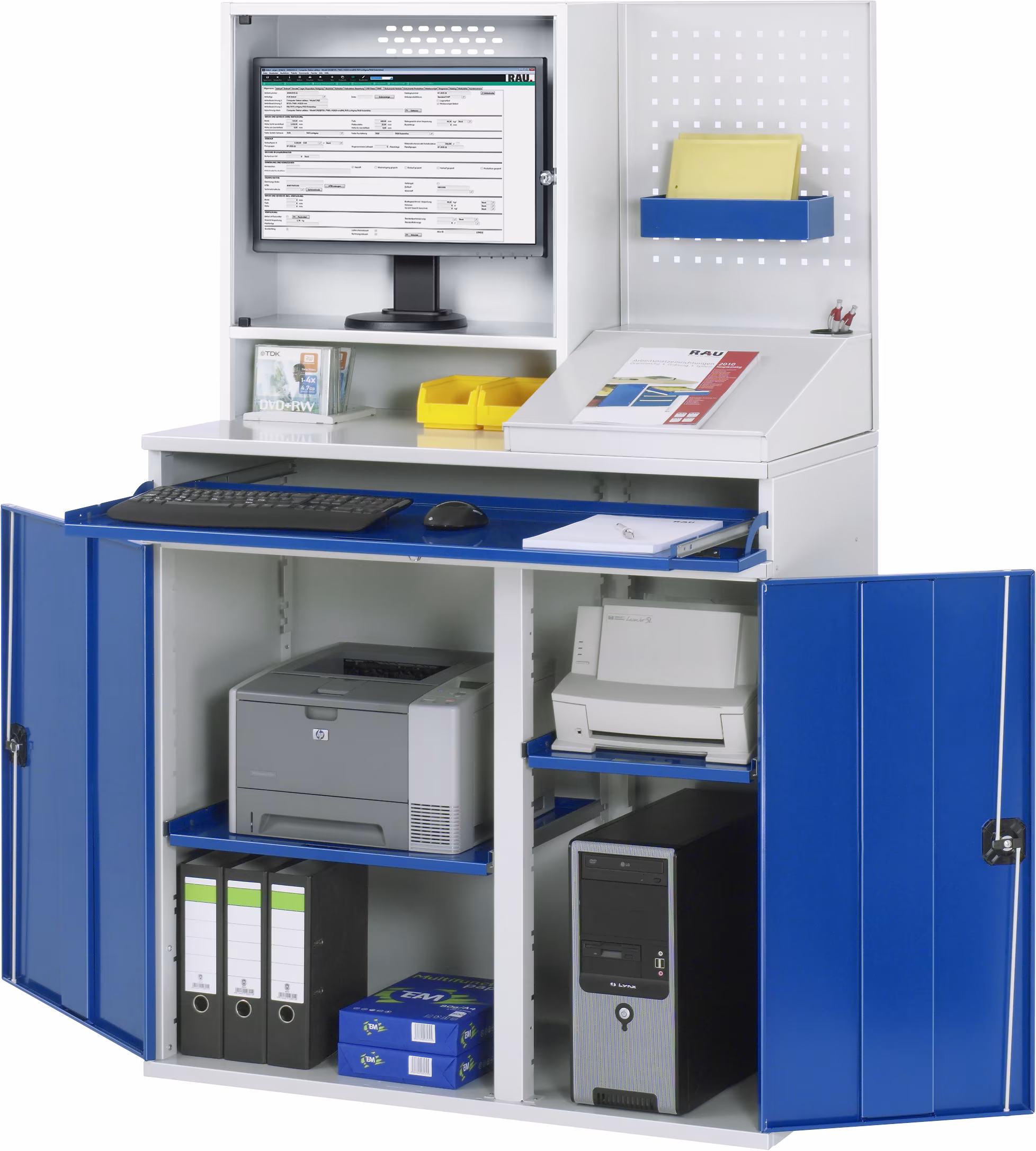 Monitorgehäuse (B650 x T250 x H710 mm) mit abschließbarem Monitorfach (innen B635 x T230 x H530 mm, integriertes Belüftungsraster) für Bildschirme bis max. 26“ geeignet. Unter dem Monitorfach ist ein offenes Ablagefach (Fachhöhe 140 mm).Lochplattenrückwand neben dem Monitorgehäuse mit 4-Kant Systemlochung (Lochung 10x10 mm, Abstand Lochmitte-Lochmitte 38 mm) zur Aufnahme von Lochplatten-Zubehör, davor Schreibaufsatz mit Klappdeckel (vorne mit Anschlagleiste) und Stiftbecher. Auflagenhöhe 400 mm. Basisschrank geteilt in separat nutz- und bedienbares Tastatur- und Flügeltürfach. Kabeldurchlässe an der Schrankrückseite, im Deckel sowie im Innenteil. Tastaturfach(Höhe 120 mm) mit Frontklappe (abschließbar) und Tastaturauszug. Tastaturauszug B1020 x T450 mm zur Tastatur- und Mausauflage (Auszug 80 %, Tragkraft 20 kg, Rastpunkt). Flügeltürfach (Höhe 850 mm) mit Doppel-Flügeltür (Öffnungsweite ca. 100°, abschließbar), Mittelstütze zur Teilung der Einbaubreite in 1xB650 mm (links) und 1xB450 mm (rechts) und mit folgender Inneneinteilung (Einbauhöhe verstellbar): links: 1 x Auszugstablar B650 x T450 mm (Auszug 80 %, Tragkraft 20 kg, Rastpunkt). rechts: 1 x Auszugstablar B450 x T450 mm (Auszug 80 %, Tragkraft 20 kg, Rastpunkt). Pulverbeschichtung Belastbarkeit gesamt max. 200 kg Lieferung komplett montiert Qualitätsgarantie 5 Jahre Made in Germany