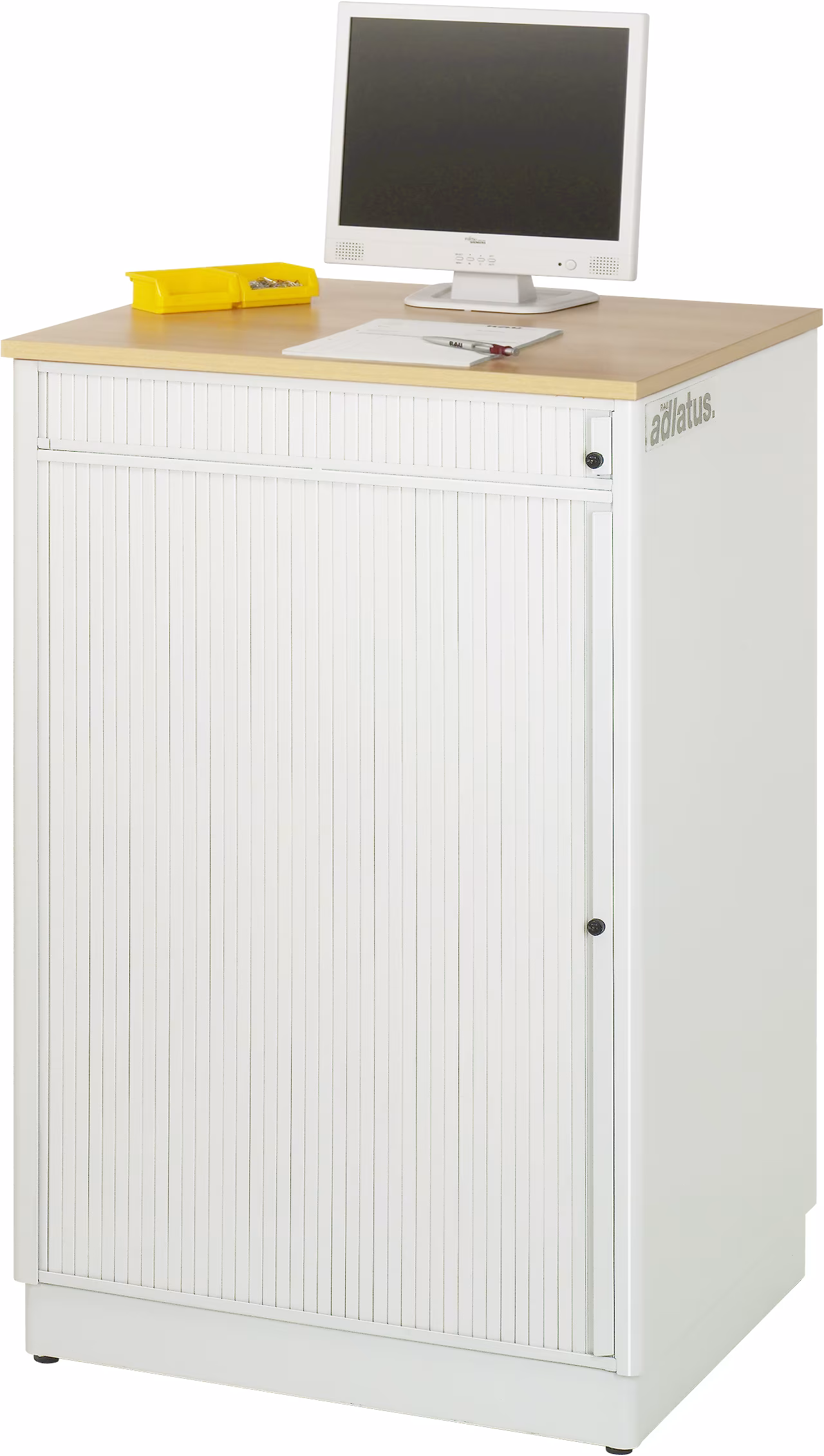 BucheDekor-Arbeitsplatte (Stärke 22 mm). Ober- und Unterseite mit einer Direktbeschichtung. Spritzwasserfest und schmutzresistent. Arbeitsplatte mit Kabeldurchlass.Basisschrank geteilt in separat nutz- und bedienbares Tastatur- und Hardwarefach. Beide Fächer sind durch einen separaten, vertikal geführten Rollladen verschließbar (Öffnung nach links). Kabeleinlass an der Schrankrückseite sowie Kabeldurchlässe im Boden sowie Innenteil. Schranksockel (H 80 mm) inklusive Verstellgleiter. Tastaturfach(Höhe 75 mm) mit Querrolladen (abschließbar, nach links öffnend) und Tastaturauszug. Tastaturauszug B575 x T350 mm inklusive links oder rechts ausziehbarer Auflage (MDF) zur Tastatur- und Mausauflage (Auszug 100 %, Tragkraft 20 kg, Rastpunkt). Hardwarefach (Höhe 875 mm) mit Querrolladen (abschließbar, nach links öffnend) mit folgender Inneneinteilung (Einbauhöhe verstellbar): 1 x Steckdosenleiste mit 4 Steckdosen, Ein-/Aus-Schalter und Anschlusskabel mit Stecker (Norm-Deutschland). 1 x Auszugstablar B570 x T450 mm (Auszug 80 %, Tragkraft 20 kg, Rastpunkt). 1 x Innenschublade B570 x T450 mm (Auszug 100 %, Tragkraft 35 kg). Pulverbeschichtung Belastbarkeit gesamt max. 200 kg Lieferung komplett montiert Qualitätsgarantie 5 Jahre Made in Germany