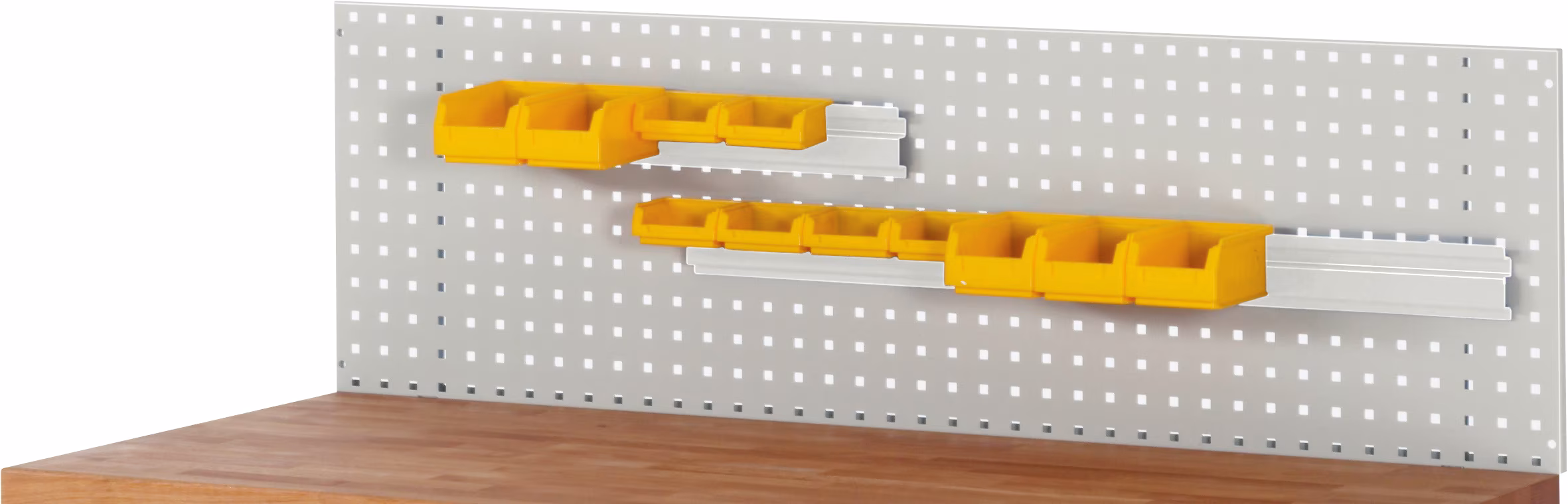 Produktinformationen "Einhängeschiene 500 mm für Lochplatte, zur Aufnahme von Sichtlagerkästen, RAL7035"