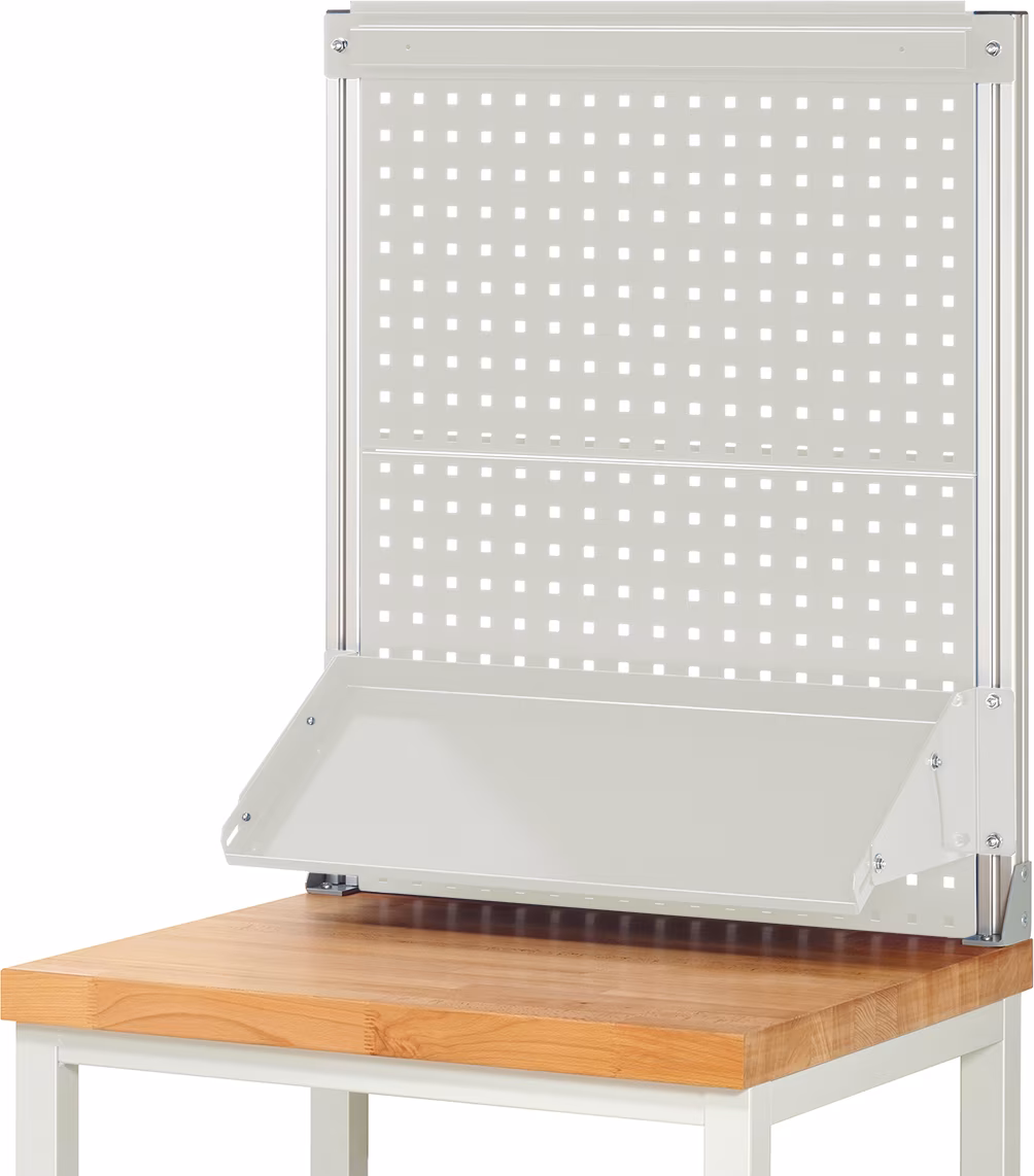 1 x System-Stützenpaar zur Montage auf die Arbeitsplatte.Die System-Stützen (Aluminiumprofil 40x40 mm) werden mittels eines Montageadapters direkt mit der Arbeitsplatte verschraubt. Die System-Stützen verfügen an allen 4 Seiten über eine Profilnut, so dass eine allseitige Nutzung möglich ist. Geeignet für: Werkbänke Serie 8000, Werkbänke Serie 7000, Schwerlastwerkbänke, Fahrbare Werkbänke Serie 8000, Werkbänke mit Fahrgestell Serie 8000, Elektrisch Höhenverstellbare Arbeitsplätze Serie adlatus 600. Montage auf: Arbeitsplatte. Aufnahme von: Anbauelemente (System-Zubehör) Bitte beachten: Die Stärke der Arbeitsplatte muss mindestens 40 mm betragen und es muss sich um eine Arbeitsplatte mit einem massiven Kern handeln. 2 x Lochplatte B665 x H450 mm Mit 4-Kant Systemlochung (Lochung 10x10 mm, Abstand Lochmitte-Lochmitte 38 mm) zur Aufnahme von Lochplatten-Zubehör. 1 x Neigbare Metallablage B665 x T300 mm; allseitige Aufkantungen. 1 x Halteschiene B665 mm für Aufnahme von Sichtlagerkästen (offene Einhängekante an der Rückseite der Sichtlagerkästen erforderlich) und/oder Energieleiste. Einbauhöhe der Anbauelemente innerhalb der System-Stützen verstellbar. Pulverbeschichtung Lieferung zerlegt - einfachste Montage Qualitätsgarantie 5 Jahre Made in Germany