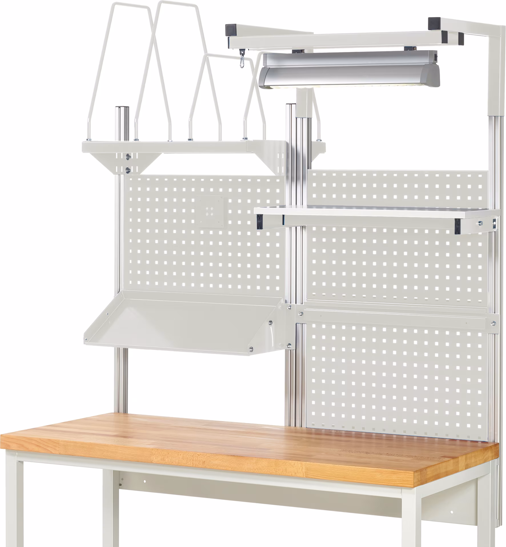 Der Befestigungssatz (Querträger) wird hinten unter der Arbeitsplatte an den Systemunterbau angebracht. Die 2 System-Stützen (Aluminiumprofil 40x40 mm) werden mittels Nutensteinen an den Befestigungssatz (Querträger) angeschraubt (Höhe einstellbar) und laufen hinter der Arbeitsplatte nach oben, so dass die gesamte Tiefe der Arbeitsplatte frei bleibt (kein Verschrauben auf der Arbeitsplatte). Die System-Stützen verfügen an allen 4 Seiten über eine Profilnut, so dass eine allseitige Nutzung möglich ist.Die 4 System-Stützen werden links und rechts außen sowie mittig angeschraubt, so dass 2 Systemfelder in der Systembreite 750 mm entstehen. Nutzhöhe 1130 (ab Oberkante Arbeitsplatte). Geeignet für: Arbeitstische Serie Jerry und Tom, Werktische Serie 900, Werkbänke Serie 8000, Werkbänke Serie 7000, Fahrbare Werkbänke Serie 8000, Werkbänke mit Fahrgestell Serie 8000, Schubladenschränke Serie 7000, Montagewagen Serie 7000, Elektrisch Höhenverstellbare Arbeitsplätze Serie adlatus 300 und 600. Montage an: Systemunterbau. Aufnahme von: Anbauelemente (System-Zubehör). 1 x Befestigungssatz (Querträger) mit 4 System-Stützen (ergibt Systembreite 2x750 mm). 3 x Lochplatte B665 x H450 mm. Mit 4-Kant Systemlochung (Lochung 10x10 mm, Abstand Lochmitte-Lochmitte 38 mm) zur Aufnahme von Lochplatten-Zubehör. 1 x Neigbare Metallablage B665 x T300 mm; allseitige Aufkantungen. 1 x Halteschiene B665 mm für Aufnahme von Sichtlagerkästen (offene Einhängekante an der Rückseite der Sichtlagerkästen erforderlich) und/oder Energieleiste. 1 x Kartonagenmagazin B665 x T600 mm; Melaminharzbeschichtete Platte mit Montagekonsolen und vorne sowie hinten angebrachtem C-Profil zu variablen Positionierung der Steckbügel mittels Systembolzen. Steckbügel 2 x H300 mm und 2 x H500 mm. Positionierung zwischen die System-Stützen mit Verschiebemöglichkeit +/- 125 mm auf den Montagekonsolen. 1 x Flachbildschirmhalter mit Montageadapter für Lochplatte (VESA MIS-D 75/100). 1 x Etagenbord B750 x T300 mm; melaminharzbeschichtete Platte. 1 x Auslegerpaar T550 x H300 mm für Aufnahme von Laufschiene/Montageschiene (max. 2 Stück). 2 x Laufschiene/Montageschiene B750 mm für Aufnahme von Beleuchtungsleiste und/oder Laufwagen mit Karabiner. 1 x Laufwagen mit Karabiner für Aufnahme von Federzug, Balancer, etc. 1 x Langfeldleuchte (Leuchtengehäuse aus Aluminium). Integrierter elektronischer LED-Konverter. Ein/Aus-Schalter, Anschlusskabel mit Stecker. Lichtfarbe neutralweiß Farbtemperatur 4000 Kelvin (840). Leuchtenleistung 10 Watt. Leuchtenlichtstrom 1323 Lumen. Leuchteneffizienz 132 lm/W. CE-Kennzeichen. Schutzart IP20. Nennlebensdauer: Umgebungstemperatur -20° bis +40°, LED-Komponenten L80B50 > 50.000 Stunden. Einbauhöhe der Anbauelemente innerhalb der System-Stützen verstellbar. Belastbarkeit gesamt max. 100 kg Belastbarkeit max. 30 kg je Anbauelement Lieferung teilmontiert Pulverbeschichtung Qualitätsgarantie 5 Jahre Made in Germany